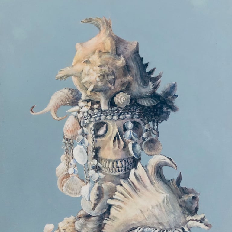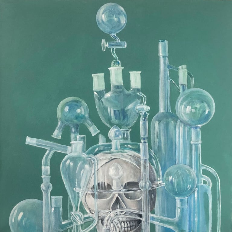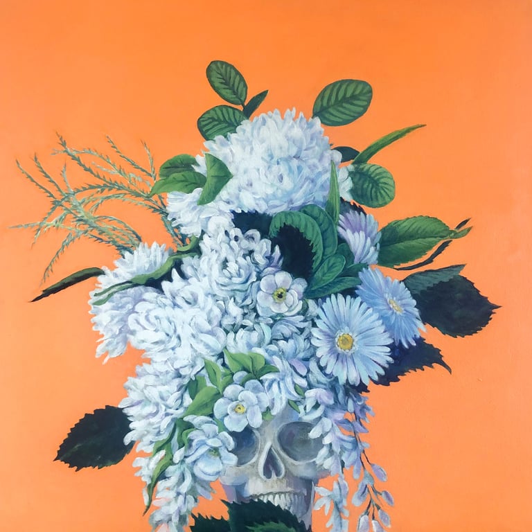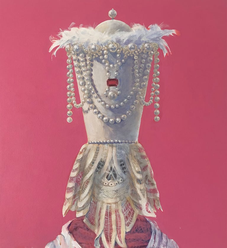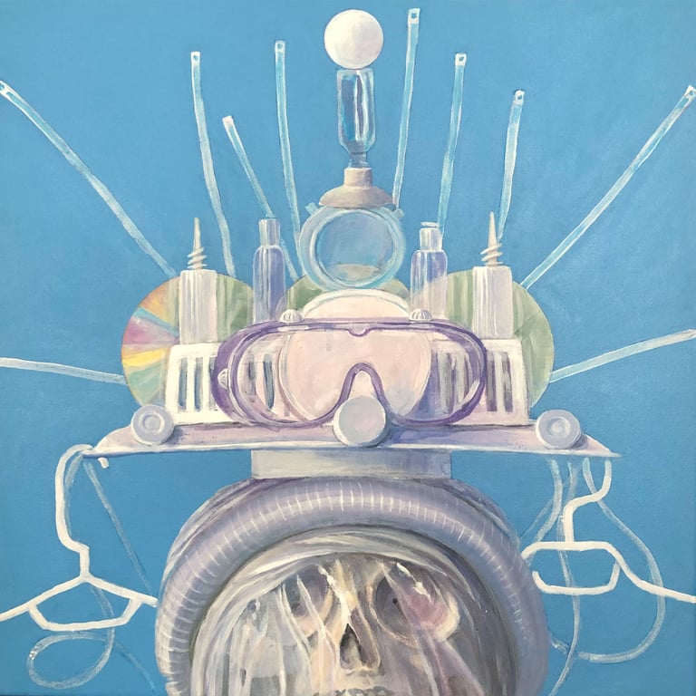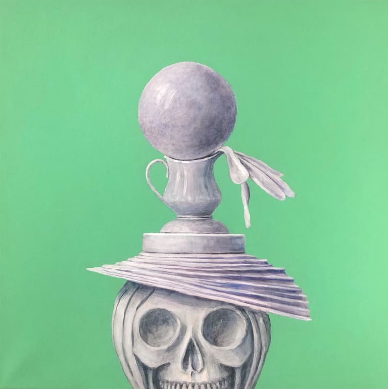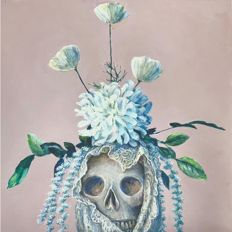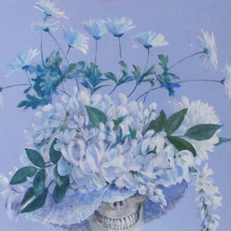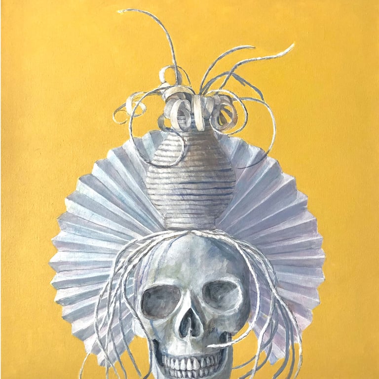Left to right and down: Contemplating civilization's reliance on plastics, 20" x 20"; Reliance on paper products, 20" x 20"; A life in alabaster, 20" x 20"; Advantages of lace and flowers, 20" x 20"; Relationship and camaraderie of bones and shells, 23" x 22"; Flamboyant floral arrangements, 28" x 28"; Deception inherent in Easter bonnets, 20" x 20"; Agency of women through history, 24" x 25"; Lab girls do okay, 24" x "24". All acrylic on canvas.
