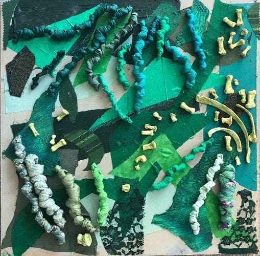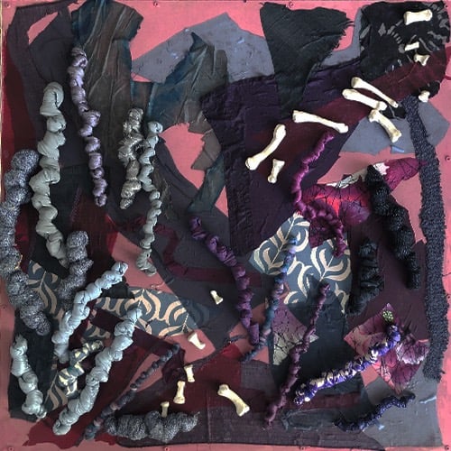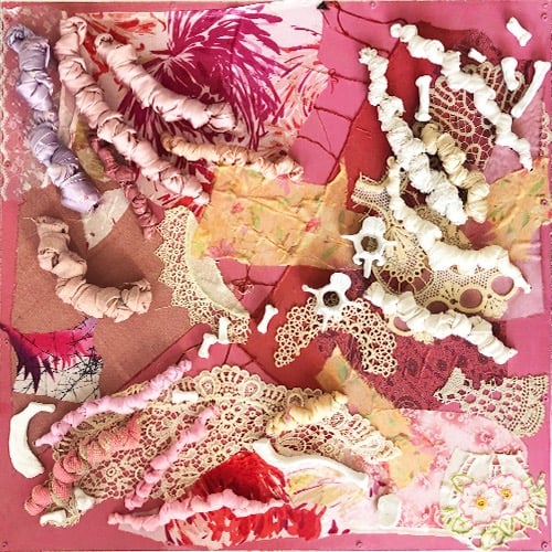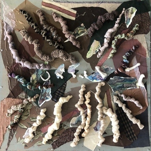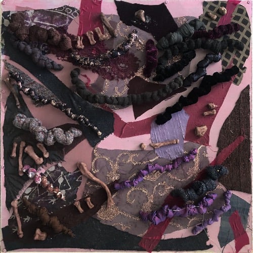 Fabric, paper, air dried clay, on mounted hardboard. Pieces are all 24" x 24"