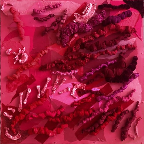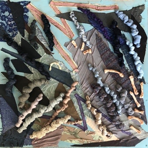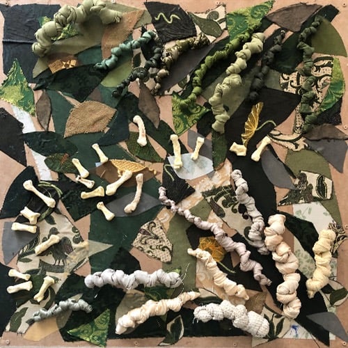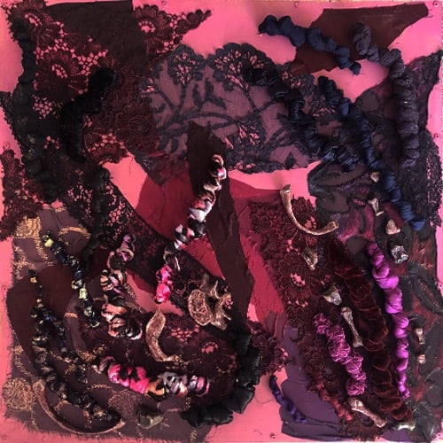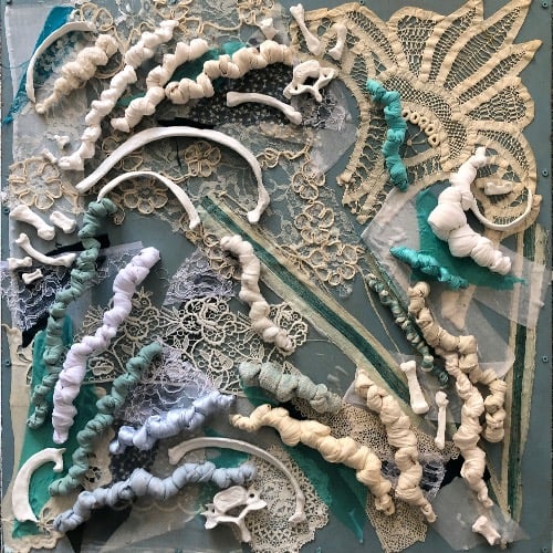 Some more decorative collage pieces with fabric and bones. So much work! So many knots! They seem particularly suited to the world now with its ongoing genocides, institutionalized corruption, and obsessions with territory and profits. Humans are a remarkable species, but we've never been very nice even though some jaw on about the better angels of our nature. We are certainly very skillful at denial and willful ignorance and we should not forget that deceit is a well honed strategy that has a billion year history of evolutionary success. Lots of life is good at it, and perhaps we are exemplary for our accomplishments in self deception. But I digress. These pieces could be fitting decor for the New Riviera planned by demented old criminals and rapacious young rogues.