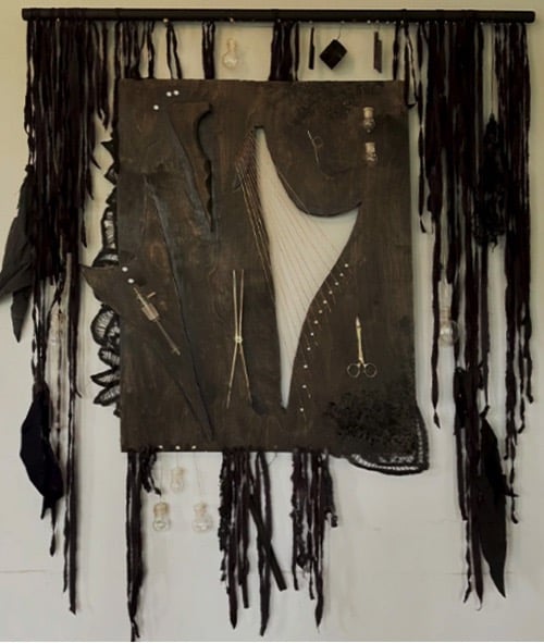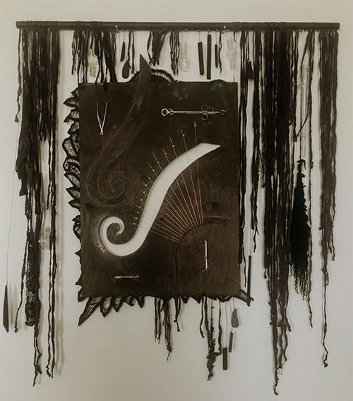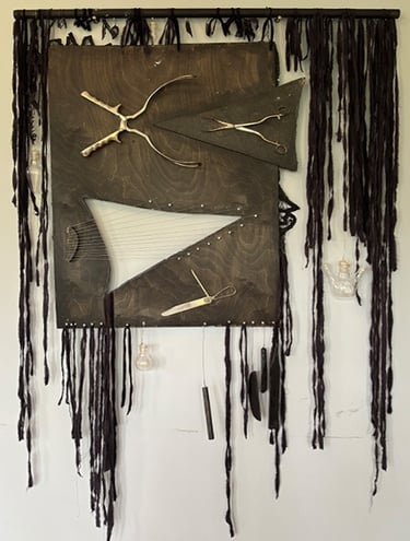 Bit of a play on the Epodes of Horace (blame poetry), the mythical Horus and a mash-up with Ra. According to the myth, Horus's eye is dispersed into six parts after a nasty bit of business with his uncle, but then Thoth intervenes and brings about a healing and reassembly. Now Ra never lost his eyes, but did cry great tears to bring about humans and everything else blameworthy. So things have been given a musical twist, music being a soothing balm and healing is a theme here. The hangings also contain surgical instruments from the early 20th century and laboratory glassware (can't forget drugs) from the mid 20th century.